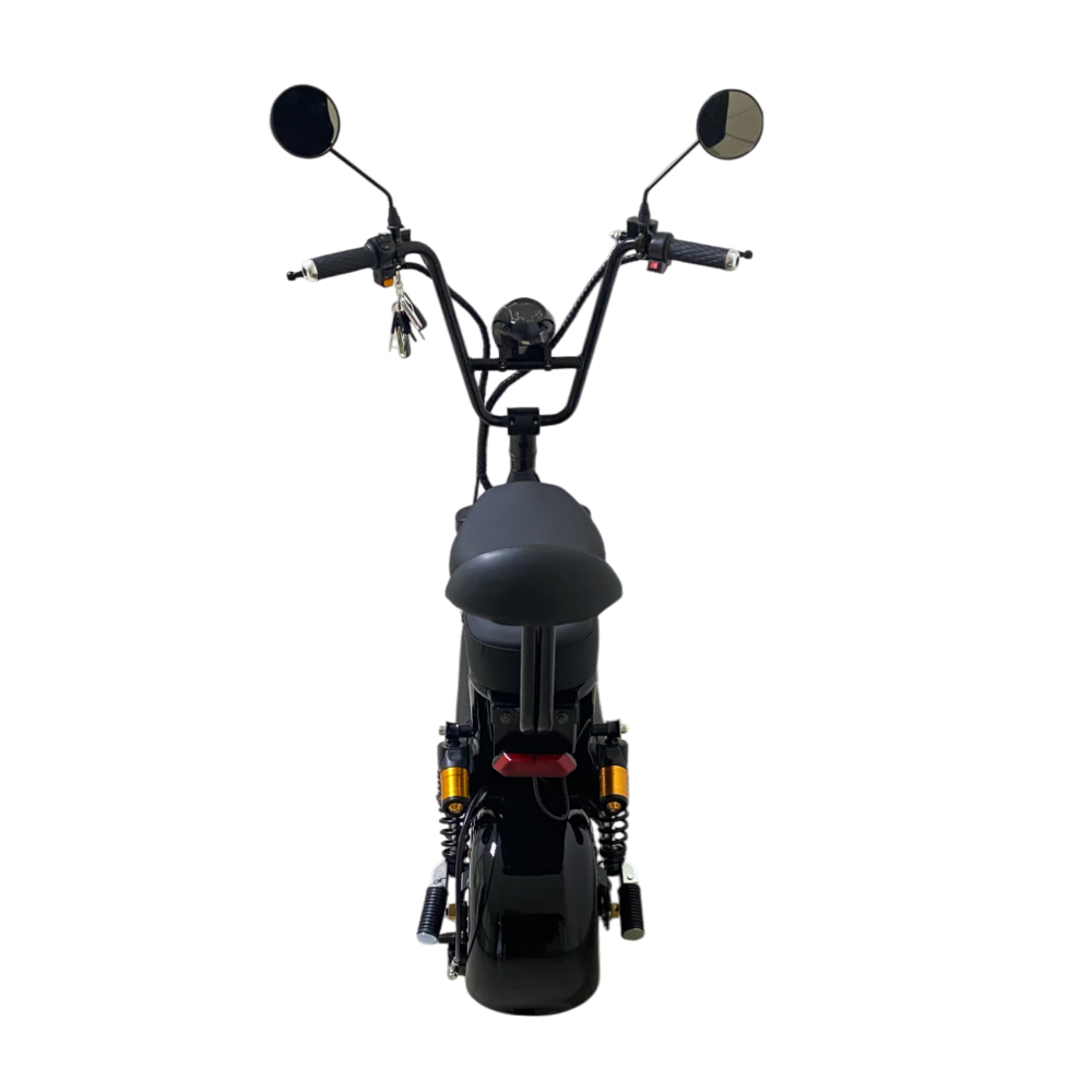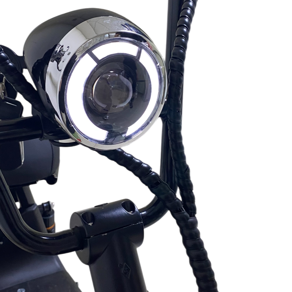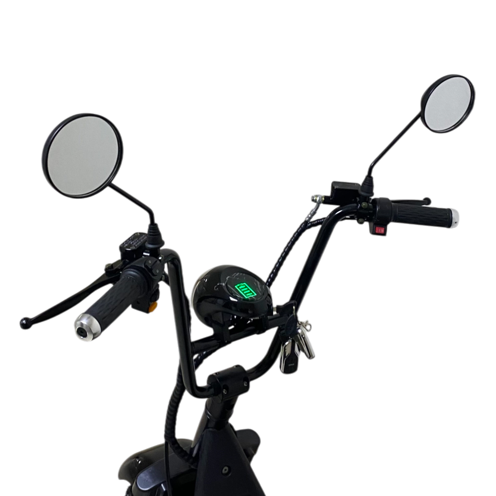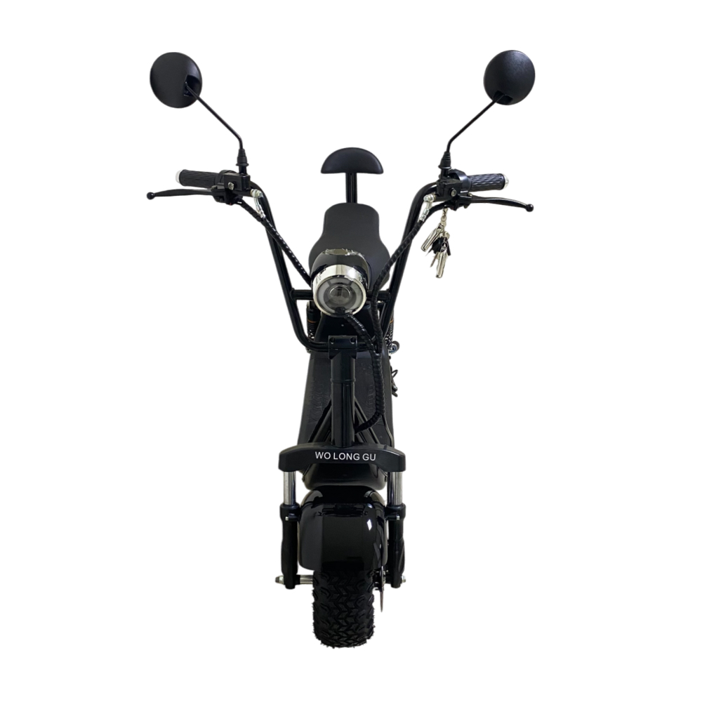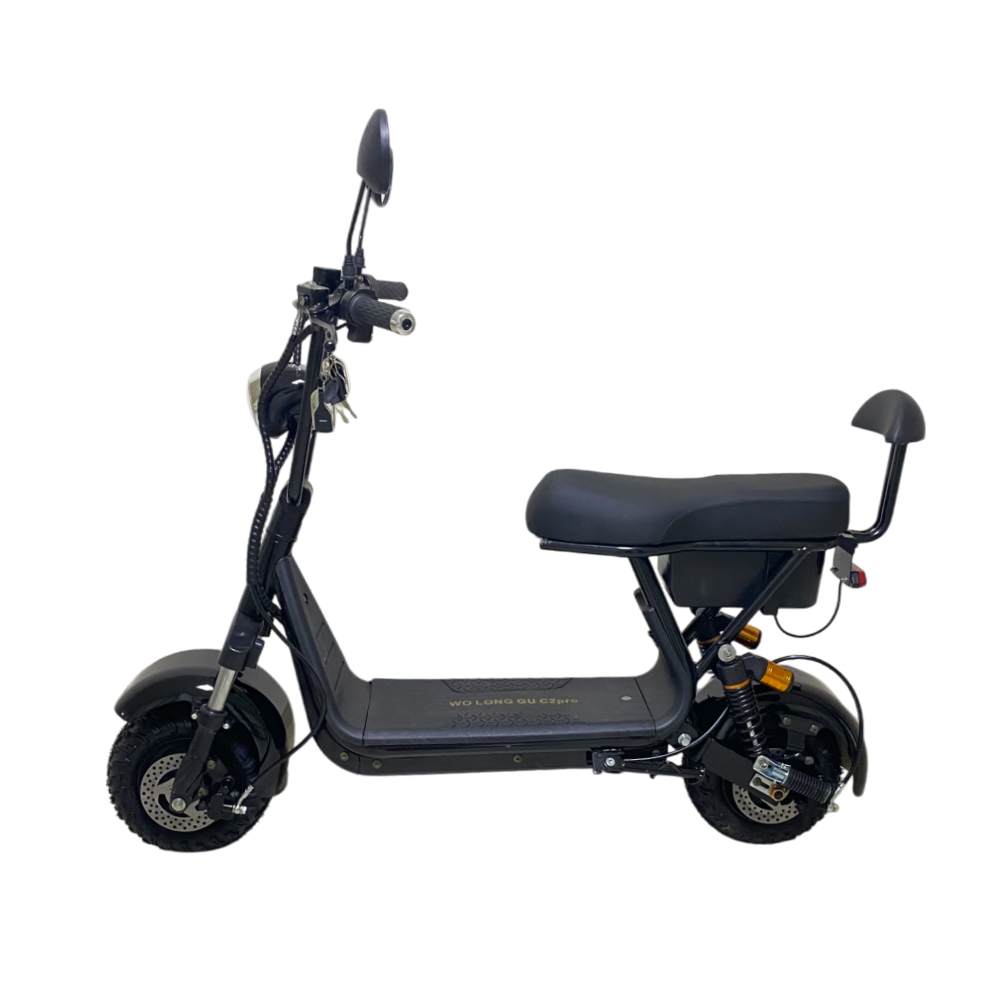 Электроскутер CityCoco WOLONG C2 Pro. Представлена модель в чёрном цвете. Это подходящее средство как для развлечений, так и для поездок на работу. Дальность хода такого аппарата составляет порядка 35 км, а время заряда литиевой батареи 6 часов.