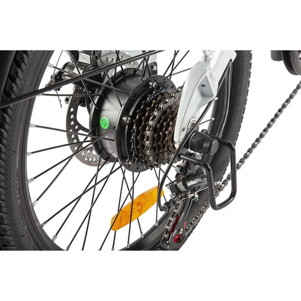 Модель представлена прочной складной конструкцией. Такая особенность позволяет брать велогибрид в путешествие, свободно транспортировать и без проблем хранить в квартире. Батарея надежно крепится под рамой для минимизации соприкосновения с ней райдера. Мощность фирменного двигателя 350 Вт позволяет моментально набирать максимальную скорость 25-30 км/час. Современные светоотражатели и диодная фара ярко освещают дорогу при поездках в ночное время суток. Широкие колеса с протекторами предназначены для свободного преодоления дорожных неровностей и лучшего сцепления с трассой.