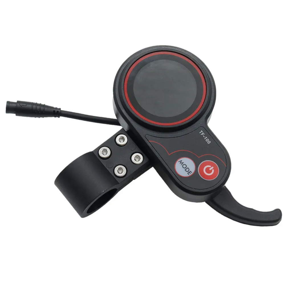 Бортовой компьютер представлен в пластиковом корпусе ,на нём располагает курок для набора скорости. Он имеет аккуратный небольшой дисплей круглой формы. Сам дисплей цветной, для управления предусмотрены 2 кнопки, а именно кнопка включения и Mode. Они требуются для навигации в меню, выбора нужных параметров, сохранения настроек и смены скорости.
